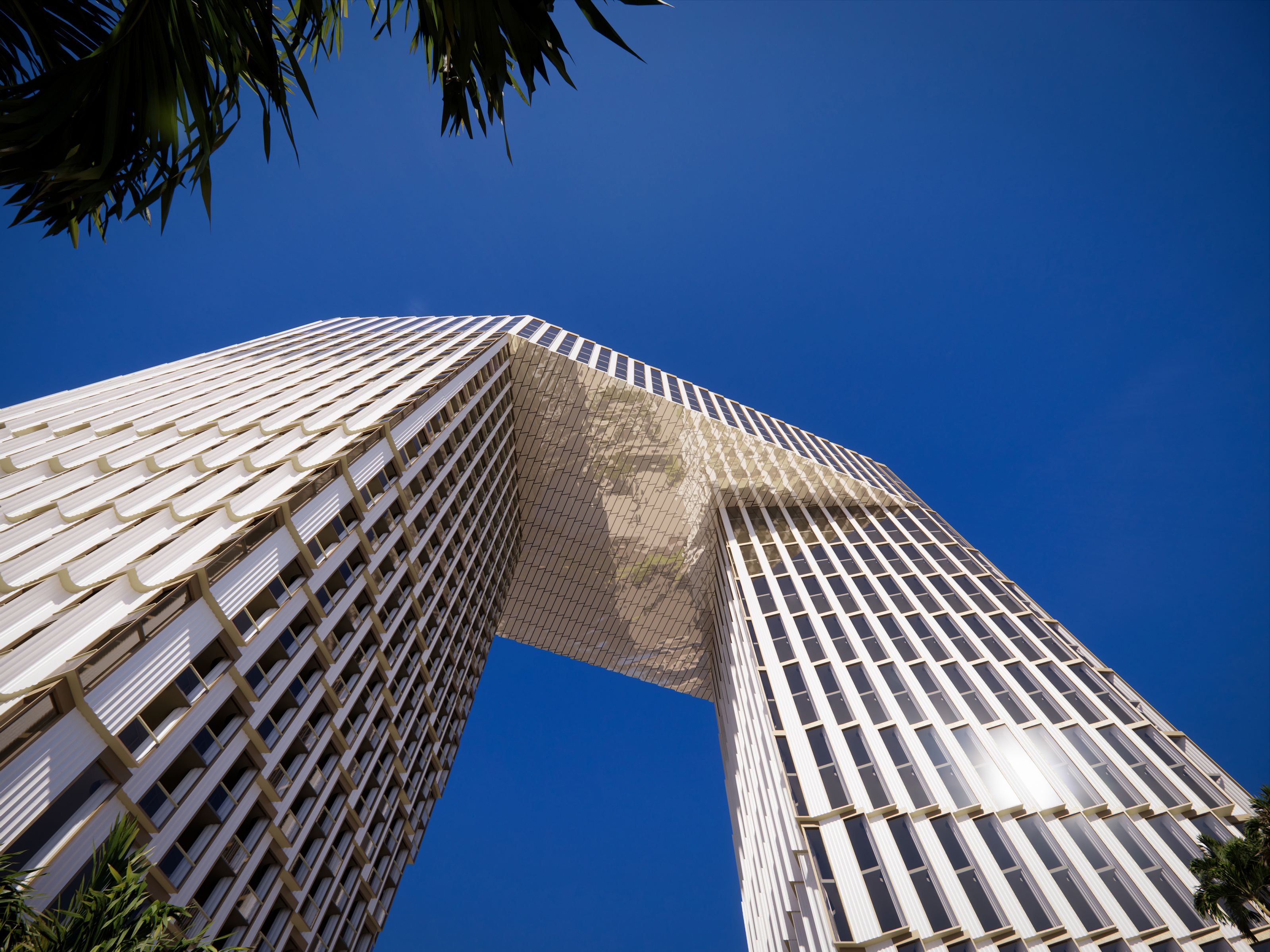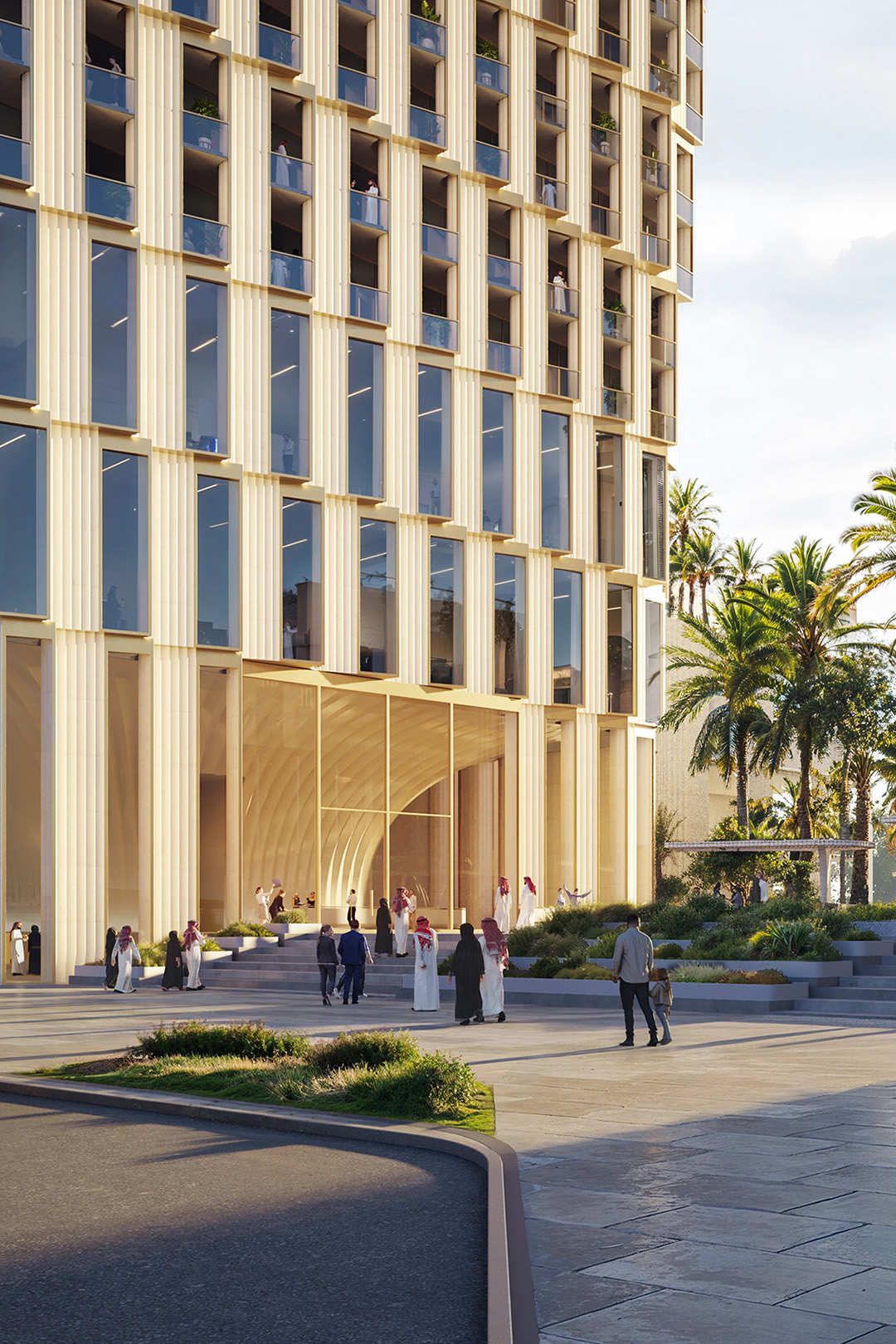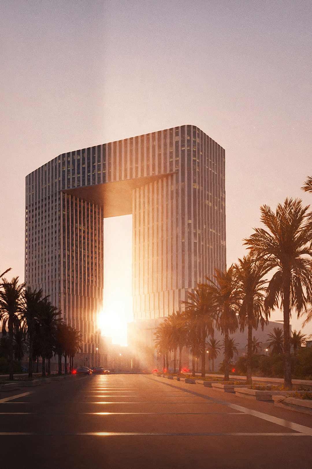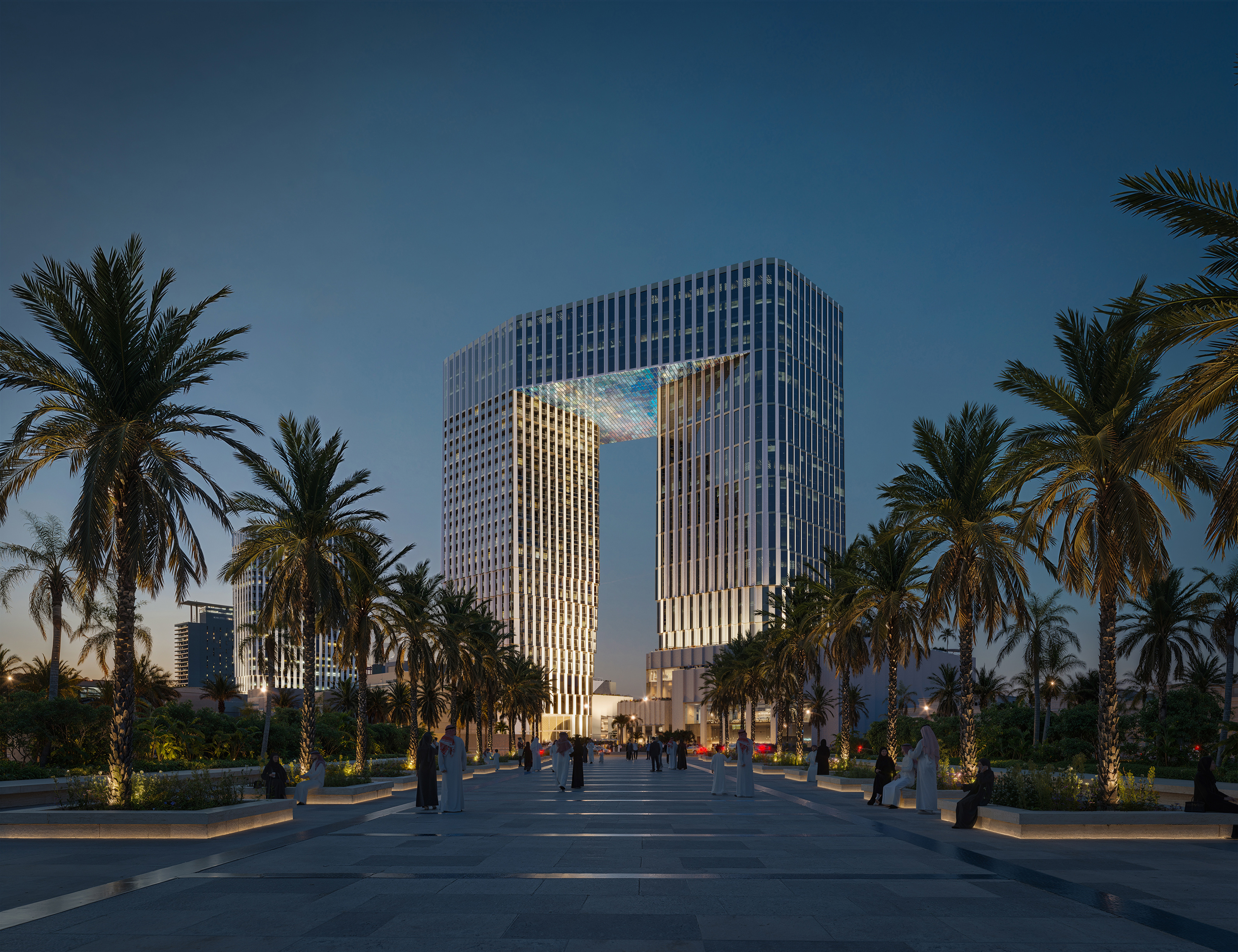 A central gate defines the composition, framing views towards the Red Sea while creating a new public retail street beneath that enhances pedestrian connectivity and urban permeability.The project combines cultural reference with functional clarity and civic presence, establishing a distinctive landmark within Jeddah's evolving cityscape.